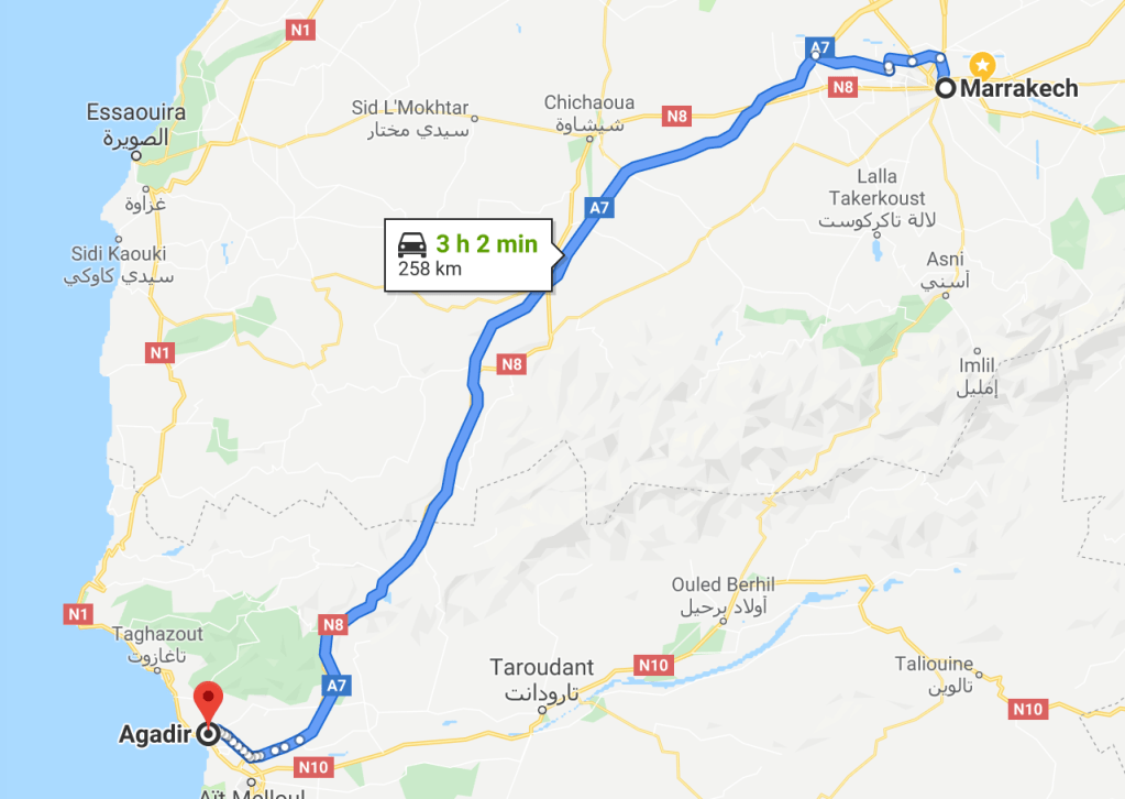 A 3 heures de Marrakech par l’autoroute, Agadir est réputée pour ses plages. Plus au sud (environ 150 km) vous pouvez les sites de Mirleft, Legzirz, Sidi Ifni. N’hésitez pas à me contacter pour un devis si vous souhaitez découvrir la région d’Agadir. Prévoir au moins 2 jours.